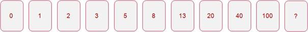 The deck of card used for planning poker is based on the Fibonacci-sequence. It consists of a increasing series of numbers, starting at 0, where the difference between two sequential cards becomes larger and larger. The idea behind this is that the psychological threshold to give a higher score also increases. The series of cards is limited to the values below: